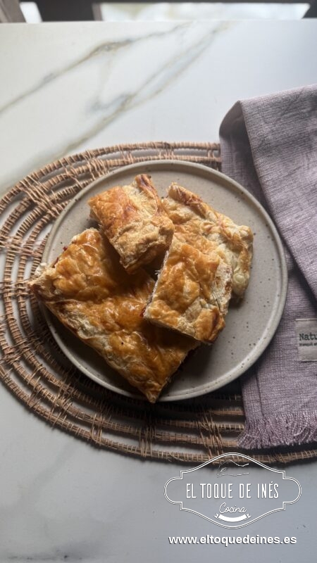 El hojaldre, crujiente y dorado, sirve de base perfecta para un relleno lleno de contrastes: la dulzura suave y melosa del pimiento caramelizado se equilibra con el punto salado e intenso del jamón serrano, mientras que el queso de cabra aporta cremosidad y ese toque ligeramente ácido tan característico que redondea el conjunto.