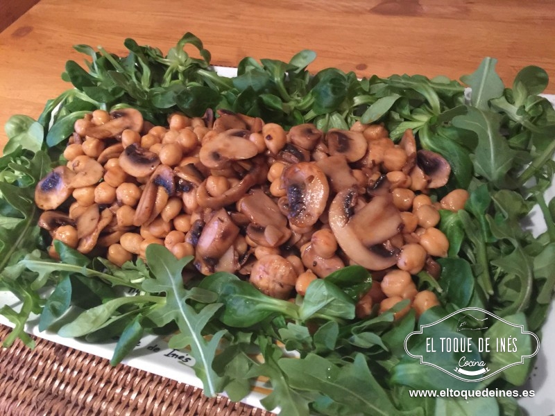 Ensalada de champiñones, garbanzos y rúcula