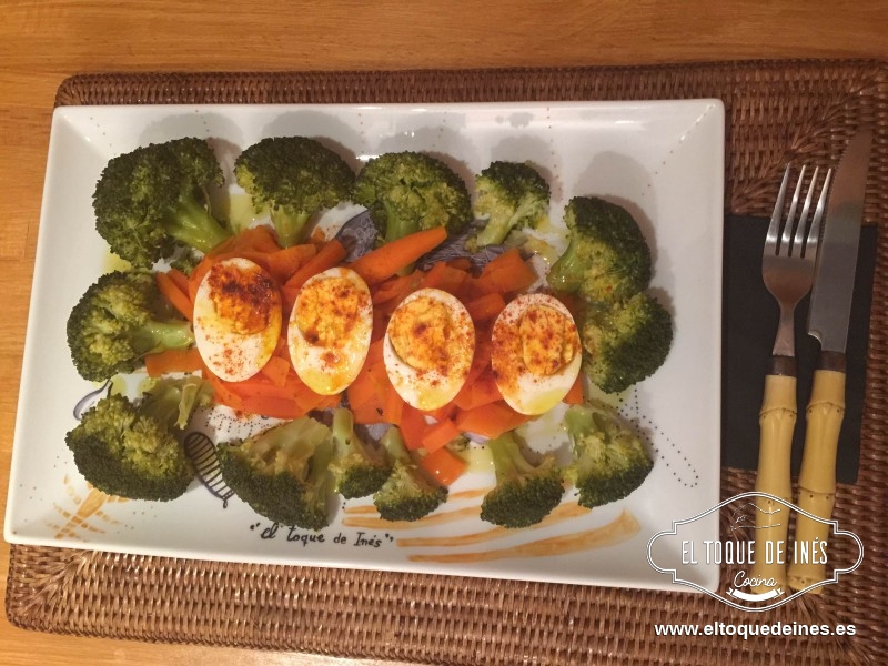 Receta ligera que se puede acompañar de unos filetes de pescado junto con las verduras, nosotros hoy hemos decidido acompáñelos de otra proteína, los huevos , que además son de nuestras gallinas así que mejor imposible.